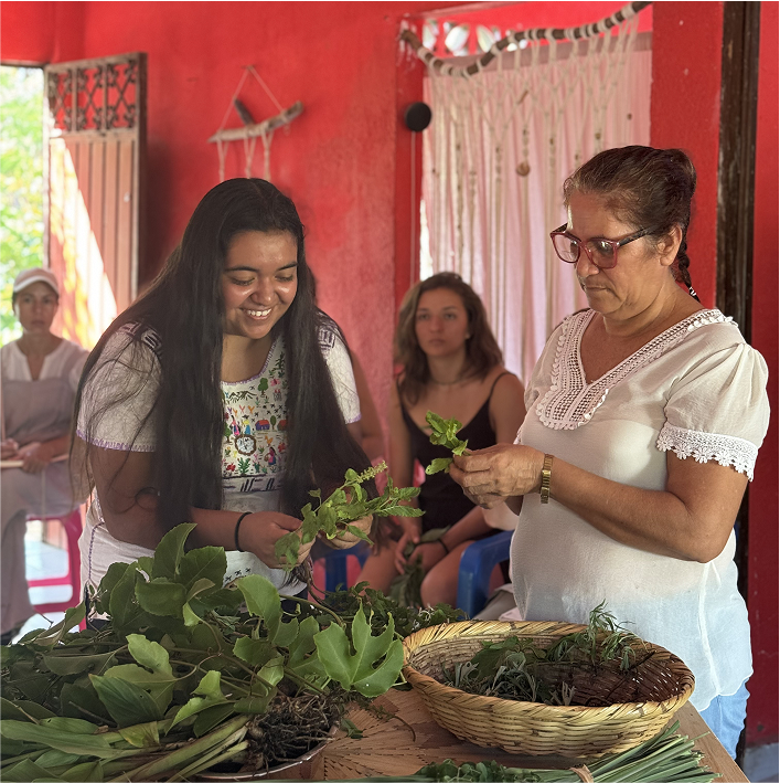 A woman and young girl are engaged in a herbal or plant activity at a table, with two other women sitting in the background in a warm-colored indoor setting with natural light.