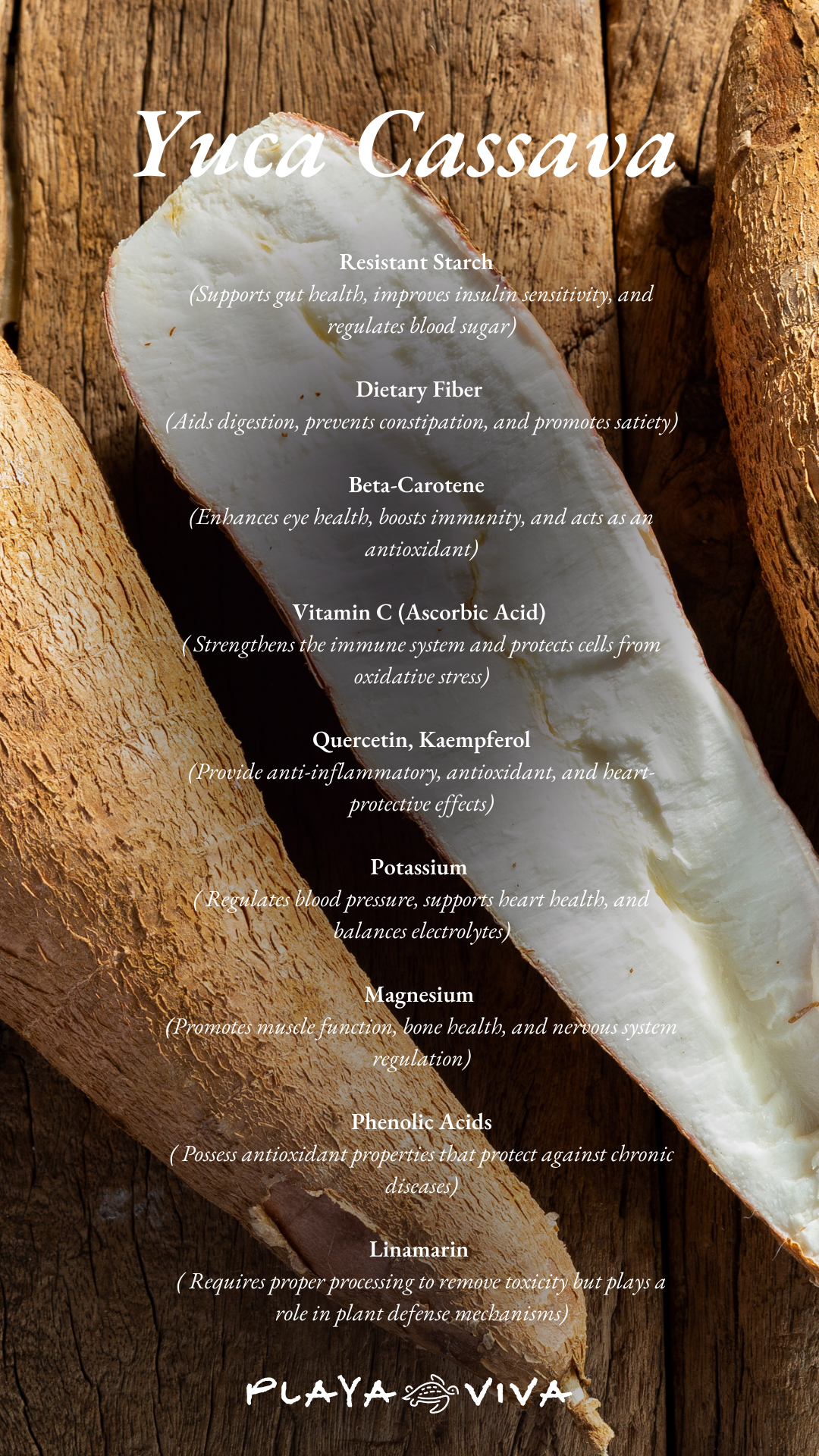 This root is rich in choline, an essential nutrient that supports nerve and brain function, as well as DNA health. Also , potassium plays also an important role in yuca and It helps with heart and kidney function.